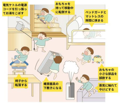 今回は、屋内の事故から3歳未満のこどもを守るための注意喚起をします。日々の見守りに加えて、事故を防ぐポイントをよく確認し、おうちの中から危険を減らしましょう。