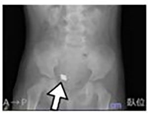 破損した玩具の磁石を誤飲した患者のレントゲン写真の例(事故事例とは別の事故のものです)