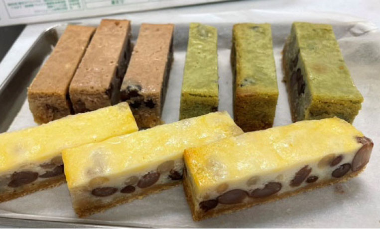 レシピを私と大阪の料理学校の先生と一緒につくり、材料を送ってもらいテストを繰り返したが、何度も割合を変えたり、味を変えたりと、すぐには完成しないのが商品開発だが、最も大変だったのが、豆の皮が取れたり崩れたりしたことで使えなくなる材料も多いことだ。通常の煮豆の作り方では難しい、スィーツでかたちをきれいに保つようにして、しかも焼いて崩れないようにするのもハードルが高い。量産するため、色々と工夫しながらなんとか形になった。