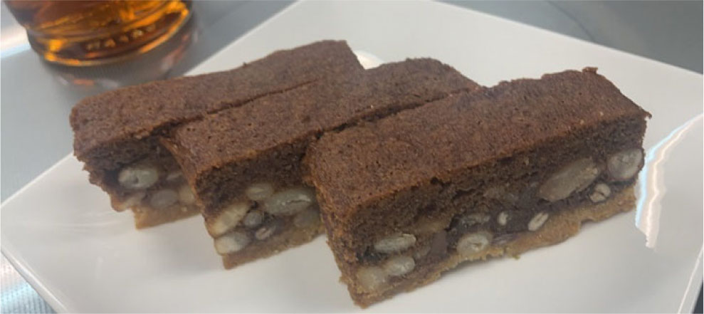 ベースとなる強力粉を使って焼いたシュトロイゼルに金時豆、小豆、手亡でかたちを崩さないようにして甘く煮た甘納豆状の豆を敷き詰め、チーズフィリング、抹茶フィリング、チョコレートフィリングを流し込み、アルコールを飛ばしたラム酒で香りを付けて焼き上げて6センチ×3センチ×高さ2センチ程度に切ってラッピングをするスタイルにした。