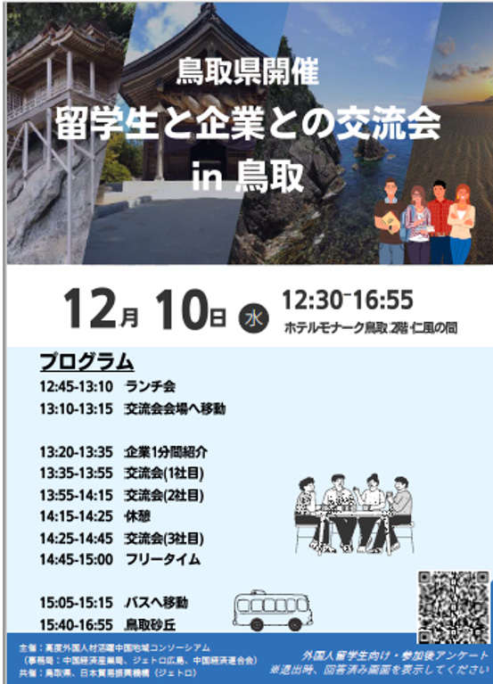 高度外国人材活躍中国地域コンソーシアム(事務局:中国経済産業局、JETRO広島、中国経済連合会)では、高度外国人材活躍の意識醸成と留学生の山陰地域等の企業に対する理解促進を目的に鳥取県との共催により、「留学生と地域企業との交流会in鳥取」を開催しました。