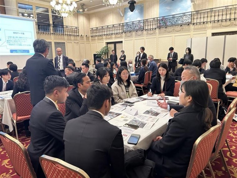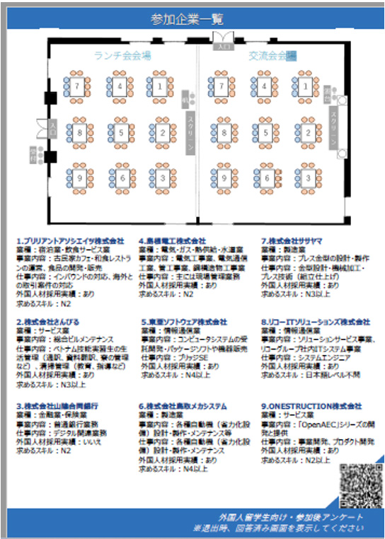 交流会には鳥取、島根の事業者9社と、鳥取、島根、岡山、兵庫からの留学生約60名に参加いただき、9箇所のテーブルに事業者がブースを構え、留学生は9つのグループ別に、それぞれのブースを回り、コミュニケーションを取っていただきました。事業者からは自社の事業概要や働き方、地域での暮らし方などを、留学生からは仕事のイメージや求める日本語レベル、在留資格などについて質問があり、最後まで双方大変熱心にコミュニケーションをしていただきました。具体的な就職相談やインターンの申し出等もあるなど、大変盛況に開催できました。