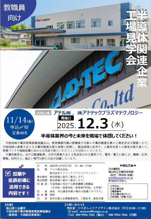 中国地域半導体産業振興協議会では、教育機関所属の教職員を対象に半導体関連企業の工場見学会を開催します。