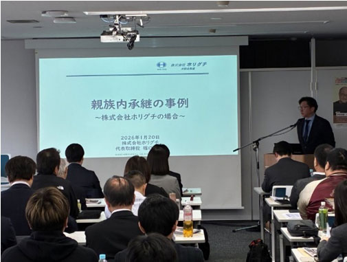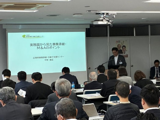 その後、親族内承継の事例を株式会社ホリグチの堀口社長から、第三者承継(M&A)による事業譲渡の事例を元 和洋菓子工房 泉屋の経営者であった古野様から、実施に至った背景や得られた成果についてお話しいただき、結びには広島県事業承継・引継ぎ支援センターから事業承継を実施する上でのポイントを説明し、閉会しました。